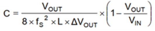 If the capacitor used is an MLCC (Multi-Layer Ceramic Capacitor), its ESR is negligible due to its very low value. Therefore, based on the input/output voltage, switching frequency, and target ripple, the capacitance can be calculated using the following formula: