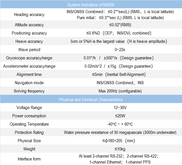 M5000 is a compact, lightweight, Pressure-Proof Fiber-Optic Strapdown Inertial Navigation System. It includes a three-axis high-precision fiber-optic gyroscope, high-precision quartz-flex accelerometer, a mobile mapping-grade multi-frequency GNSS receiver with standalone positioning capability, and an optional Doppler Velocity Log (DVL).